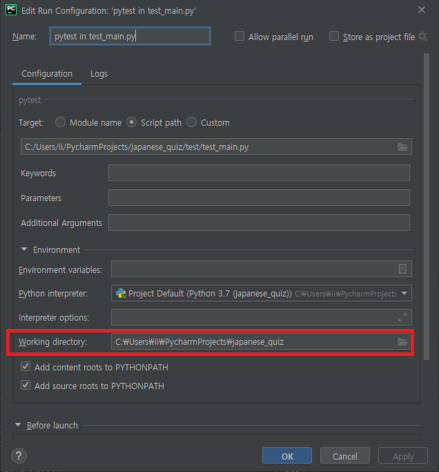 사진의 빨간 네모 안에 있는 Working directory를 바꾸어 주었습니다.